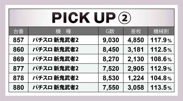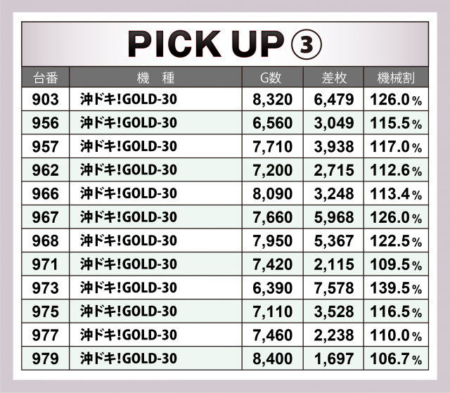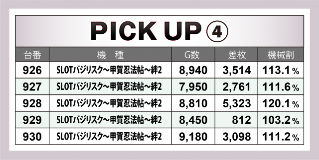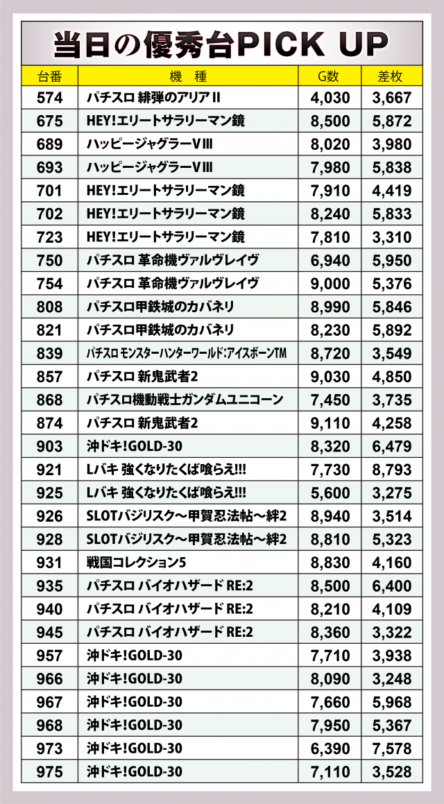 まずは優秀30台のPICK UPから。30台の全てが差枚数+3千枚以上を達成、+4千枚以上は19台、+5千枚オーバーは14台、+6千枚オーバーは4台と、かなりのハイクオリティぶりを実現した。また、後述する好調4マシン以外では、『HEY!エリートサラリーマン鏡』が+5千枚超をツートップに4台の合計が+2万枚目前、『パチスロ 革命機ヴァルヴレイヴ』『パチスロ甲鉄城のカバネリ』では各自+5千枚超×2、『Lバキ 強くなりたくば喰らえ!!!』は+9千枚弱の台を筆頭に2台トータルで+1万3千枚近くの好記録を残した。