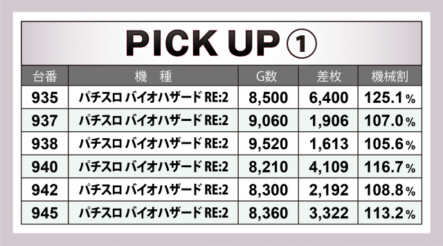 続いては当日好調だった4機種計29台をチェック。29台中28台が4桁プラスを実現し、12台の好調が目立ったのが『沖ドキ!GOLD-30』。+7千枚強・+6千枚強が1台ずつ&+5千枚超が2台&12台のトータルでは+4万8千枚目前を実現。また、『パチスロ バイオハザード RE:2』では+6千枚超の台を筆頭に6台の合計で+2万枚直前、『パチスロ 新鬼武者2』では+5千枚弱の台をトップに6台合わせて+1万7千枚オーバーを記録、『SLOTバジリスク~甲賀忍法帖~絆2』は+5千枚オーバー台を筆頭に5台トータルで+1万5千枚超をマークした。