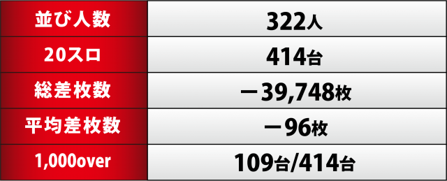 今回、[1000円/46枚]スロ414台のトータルはマイナスと、デビュー戦は黒星スタートを喫してしまった。一方で1,000overは全体の4分の1強と、他店取材と比べても遜色ないハイレベルな結果で終えることができた。また、優秀30台の差枚数に注目するとトータルマイナスであることが信じられないが、これは好調・不調台のメリハリが効いた営業が行われている証であり、今後の同店における「英雄」取材では注意したいポイントだ。初戦で勝利を飾ることができなかったことは悔しいが、次回の取材では圧倒的なプラスによりリベンジを果たしてもらいたい。