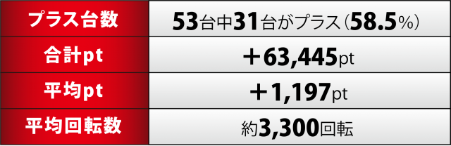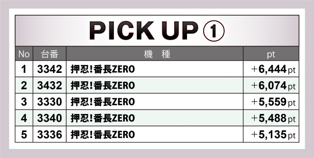 まずは『押忍!番長ZERO』53台。圧倒的な設置台数により、合計で+6万3千ptオーバーの大量獲得を実現。また、この日のトップ5は+6千pt超×2&+5千pt超×3というハイクラスの結果を成し遂げた。
