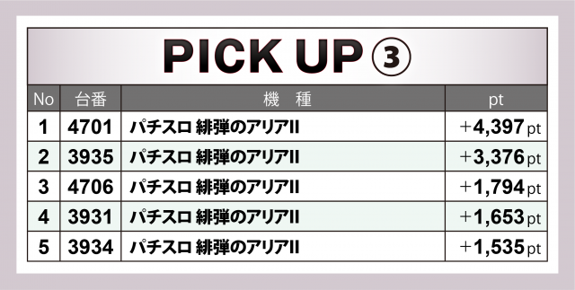 最後は『パチスロ 緋弾のアリアII』8台。全ての台がプラスを実現し、平均ptは+2千弱、平均回転数はここで挙げた3機種の中で最も高い7千5百超という稼働の良さとなった。またトップとなった4701番台は+4千3百pt超というスコアに。