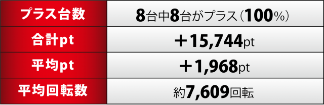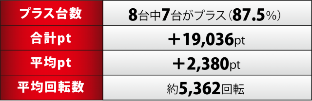 さらに、この日は『パチスロ アクエリオン ALL STARS』7台も好調。プラス率が全体の8割超&合計+9千ptという記録を果たした。