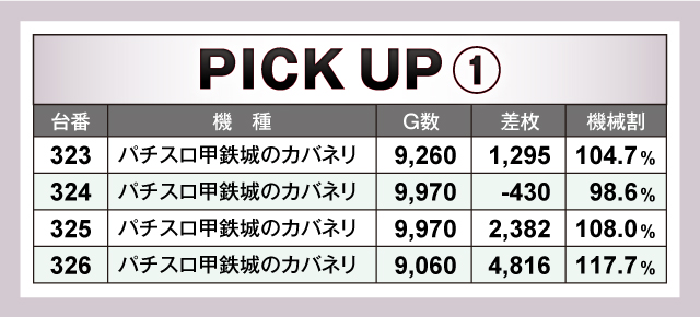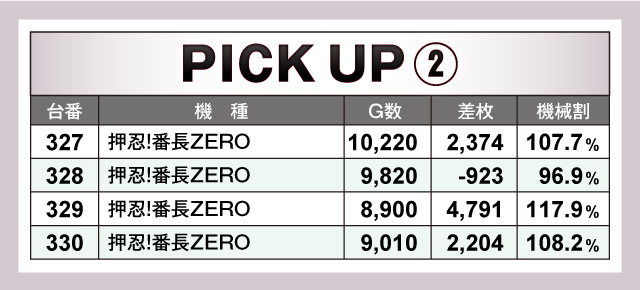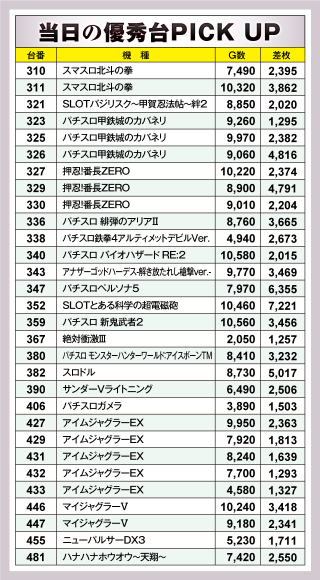 さらに詳しく見てみると、『パチスロ甲鉄城のカバネリ』や『押忍!番長ZERO』、さらにバラエティーコーナーでも並びで好記録を叩き出した注目すべきコーナーが続出。好調な台の隣にもチャンスがあるということを、ぜひ記憶しておいていただきたい。