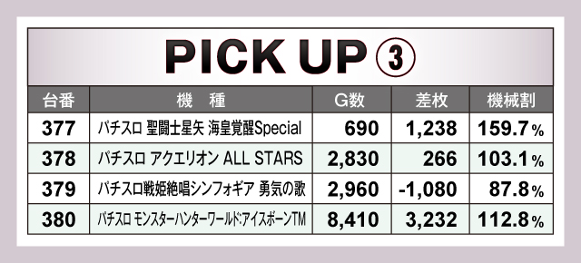 まずは、注目の優秀台PICK UPの紹介。さまざまな人気機種が素晴らしい記録を残したが、『SLOTとある科学の超電磁砲』の差枚+7,000枚オーバーをはじめ、『パチスロペルソナ5』は+6,000枚オーバー、『スロドル』では+5,000枚オーバーと、ホール内でも特に目を引く記録となった。