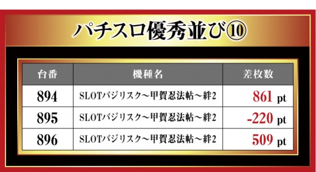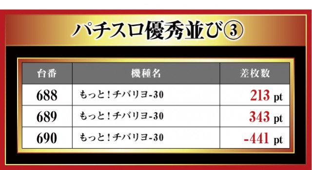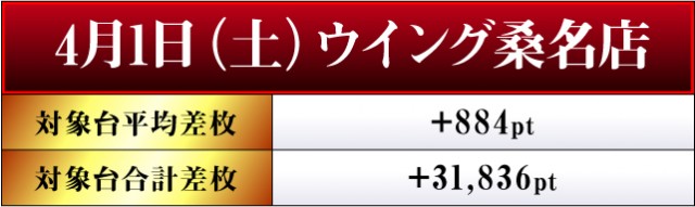 恒例となった月イチ実施の「はねバト!」。4月1日に実施された「桑名店」の優秀台をお伝えしていこう。差枚が出ている台をピックアップすると、『ハナハナホウオウ~天翔~-30』の755番台、757番台、767番台、768番台。『沖ドキ!GOLD-30』の738番台などが優秀だ! なお、6.5号機の『パチスロ幼女戦記』はスペック的に辛めなので3台並んで高設定だとしても今回のような結果になることもあるだろう。裏を返せば3台並びにしやすい機種とも言える。