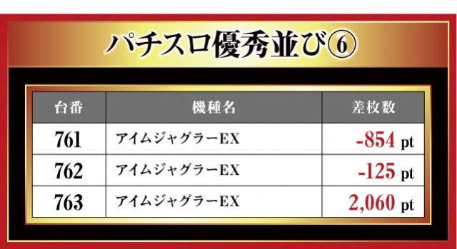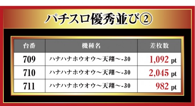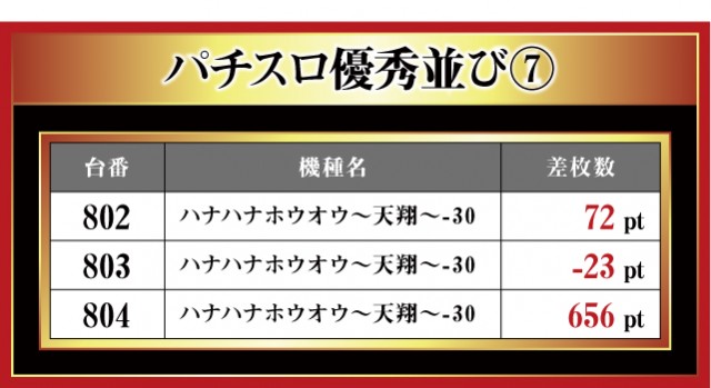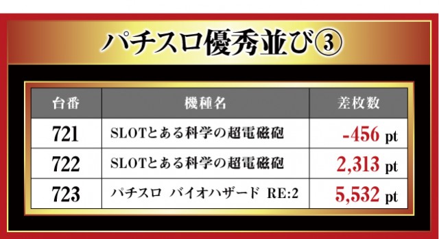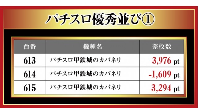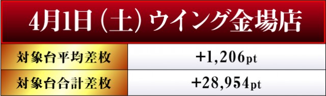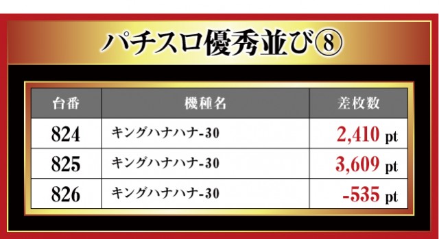 恒例となった月イチ実施の「はねバト!」。4月1日に実施された「金場店」の優秀台をお伝えしていこう。ノーマルタイプが強い印象の「金場店」だが、今月はAT機のほうに差枚が出ている台がある。『パチスロ甲鉄城のカバネリ』の613番台、615番台。『パチスロ バイオハザード RE:2』の723番台がそれに該当する。ノーマルで注目だったのが新台で導入されたばかりの『キングハナハナ-30』だ。今回は824番台~826番台が3台並びとなっていた。今後は新たなハナも見逃せないぞ!