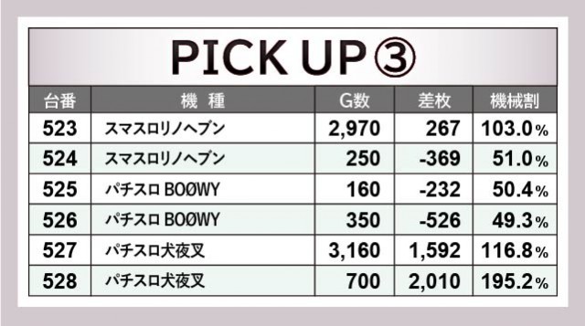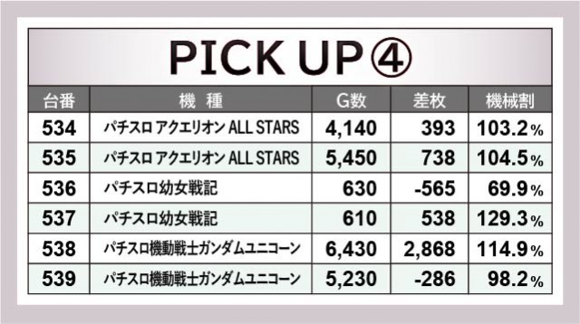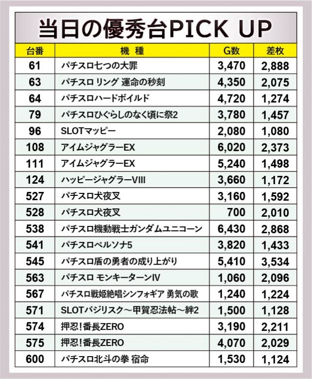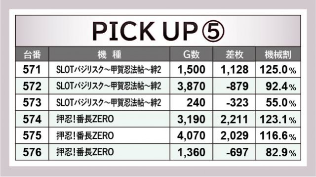 523~528番台・534~539番台・571~576番台もまた、6台横並びの好況スポットを形成していたエリアである。『パチスロ機動戦士ガンダムユニコーン』538番台+2,868枚や『押忍!番長ZERO』574番台+2,211枚などの記録を確認でき、こちらでもしっかりと結果を残しているのが目に焼きつく。『パチスロ犬夜叉』528番台+2,010枚は少ない回転数ながらまとまった出玉を確保しており、より回転数が重なっていれば、万枚などの大きな結果が出ていたのかもしれない。