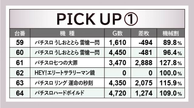 当日の最高記録は『パチスロ盾の勇者の成り上がり』545番台+3,534枚となっており、右肩上がりに伸びる出玉によって、ファンの意欲を掻き立てていた。これに続いて『パチスロ七つの大罪』61番台+2,888枚や『パチスロ機動戦士ガンダムユニコーン』538番台+2,868枚などが発生。各所でまとまった出玉を獲得する光景を確認でき、遊技していたファンは手ごたえを感じていたことだろう。