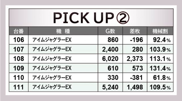 全体的に回転数不足が否めないが、それでもしっかりと結果を出しているのは、同店の気概の表れだろうか。『パチスロ七つの大罪』61番台+2,888枚を筆頭に59~64番台の6台横並び好況スポットを確認できれば、『アイムジャグラーEX』では106~111番台の6台が同じく横並びの好況スポットを形成していた。後者もまた108番台+2,373枚という数字が見られ、右肩上がりにグラフを描いていた様子が窺える。