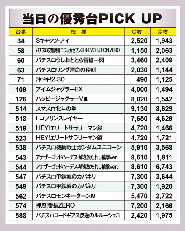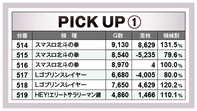 まずは優秀台PICK UPからみていこう。この日のトップ差枚数を獲得したのは514番台の『スマスロ北斗の拳』で+8,629枚と圧巻の記録となった。次いで544番台の『アナザーゴッドハーデス-解き放たれし槍撃ver.-』で+6,743枚、さらに518番台の『Lゴブリンスレイヤー』で+4,629枚をマークし、そのほか様々な機種が光っていた。