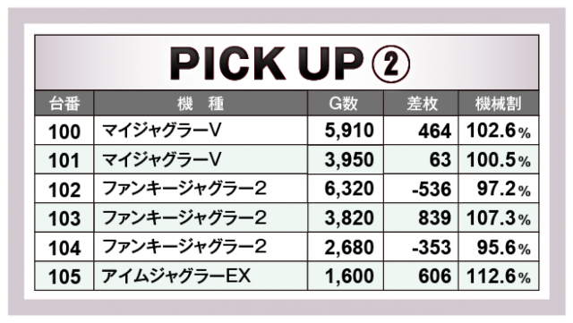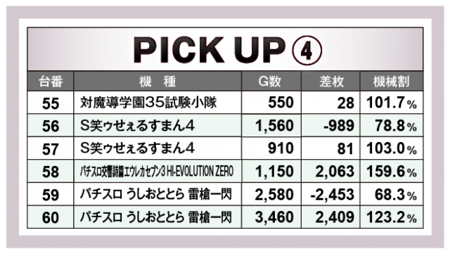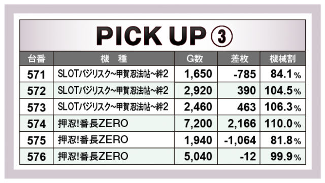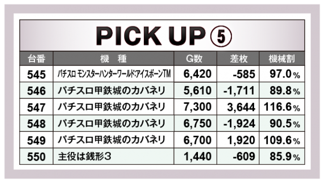 続いては5か所の横並び好況スポットをみてみよう。中でも突出して目立っていたのが上記でもお伝えした『スマスロ北斗の拳』『Lゴブリンスレイヤー』の最新台で、マイナス台を含みつつも514番台の+8,629枚を筆頭にスマスロ機の圧倒的存在感を示していたのが窺える。次いで、老若男女問わず人気のジャグラーシリーズでは『マイジャグラーV』『ファンキージャグラー2』『アイムジャグラーEX』の3機種が並んで好調ぶりをみせた。また、『SLOTバジリスク~甲賀忍法帖~絆2』『押忍!番長ZERO』や『パチスロ甲鉄城のカバネリ』といった定番人気機種や『パチスロ交響詩篇エウレカセブン3 HI-EVOLUTION ZERO』を筆頭にバラエティなど様々な機種が名を連ねて盛り上がりを見せていた。