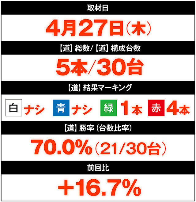 前回4月17日のヒーローズロードにおいて、【道】勝率53.3%の記録となった「マルハン小山店」。