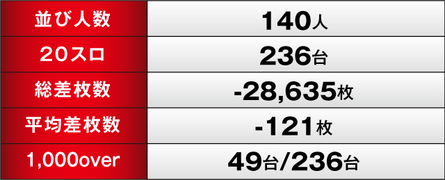 大台を突破する台が出るなど、随所に光るところは見られたが、全体的には出玉に恵まれず、トータルの差枚はマイナスに甘んじた。しかし、心配するには及ばない。1,000over台も49台/236台を記録。何より、大勝利を記録した第4回も、第3回の惜敗のリベンジ戦だった。次回への期待は高まるばかりだ。