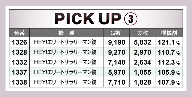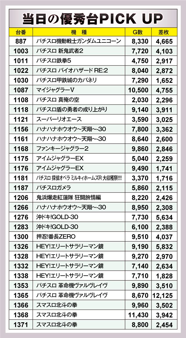 優秀台として大きな注目を集めたのは、+12,125枚を記録した『パチスロ 革命機ヴァルヴレイヴ』の1365番台。その実力をこれ以上ないかたちでアピールしてみせた。それに次ぐ+5,832枚をマークした『HEY!エリートサラリーマン鏡』の1326番台。トップの差枚には及ばなかったが、この出玉も相当すごい。僅差で続いたのが+5,634枚の『沖ドキ!GOLD-30』1276番台。スマスロにひけを取らない成果をあげているのはさすがとしか言えない。以下、+4,755枚の『マイジャグラーⅤ』1087番台、+4,665枚の『パチスロ機動戦士ガンダムユニコーン』1887番台、+4,103枚の『パチスロ 新鬼武者2』1003番台、+4,037枚の『押忍!番長ZERO』1300番台と続いた。