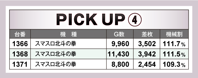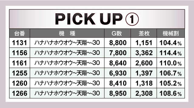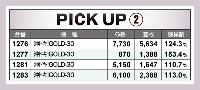 ピックアップ機種では、『ハナハナホウオウ〜天翔〜-30』、『沖ドキ!GOLD-30』、『HEY!エリートサラリーマン鏡』、『スマスロ北斗の拳』のシマが盛り上がりを見せていた。