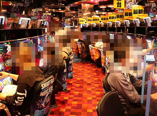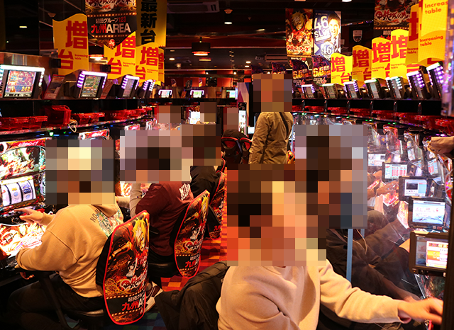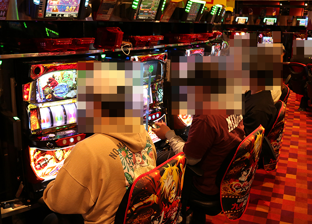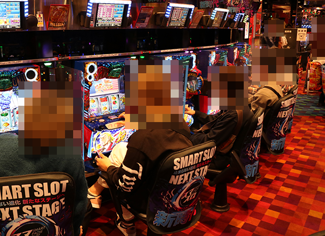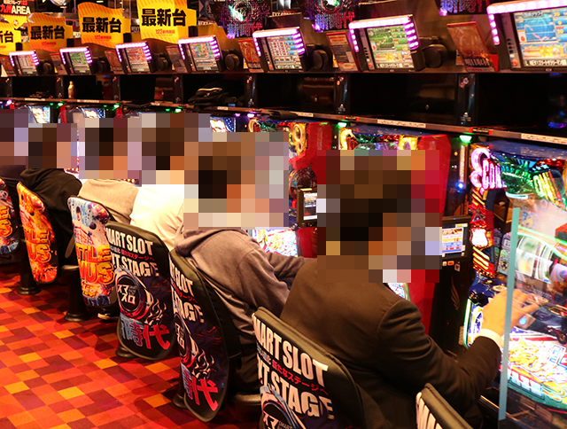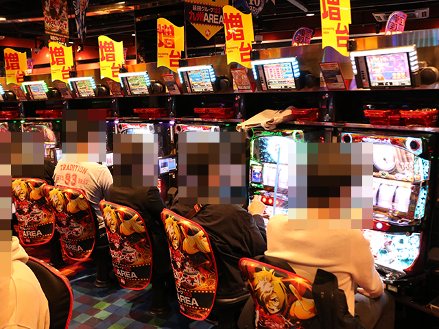 群青の旗を抱えてパチスロコーナーをまわっていくと、随所からにぎわいが感じられ、プレイヤーたちが充実した時間を過ごしていることがうかがえた。