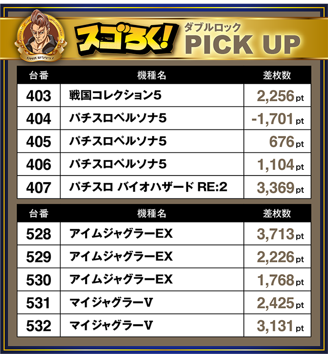 528番台の「アイムジャグラーEX」が3,713pt、532番台の「マイジャグラーⅤ」も3,131ptと、ナイスな結果。