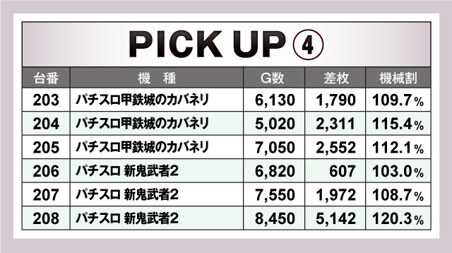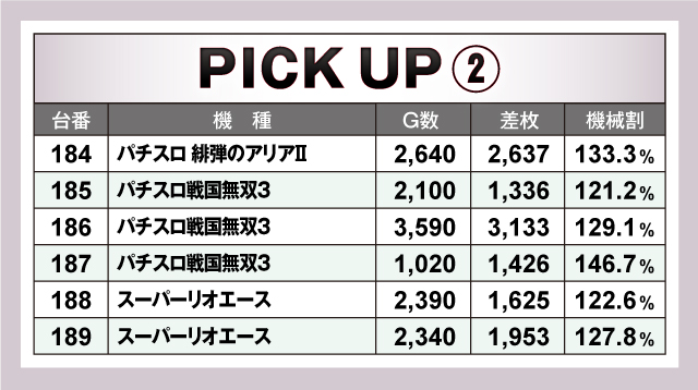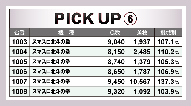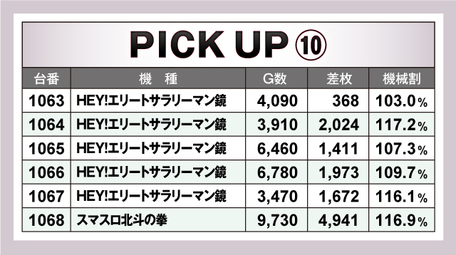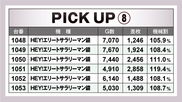 続いては、当日6台並びで好結果を残した11箇所66台を見ていこう。「アナザーゴッドハーデス-解き放たれし槍撃ver.-」「パチスロ甲鉄城のカバネリ」「パチスロ 新鬼武者2」「HEY!エリートサラリーマン鏡」「パチスロ 革命機ヴァルヴレイヴ」など、数えきれないほどの機種が活躍し、11箇所66台全てがプラス終了! この日、遊技していたファンたちが羨ましいとしか言えない結果を残した。これらの数値を見れば、当日の盛り上がり具合が分かってもらえるだろう。