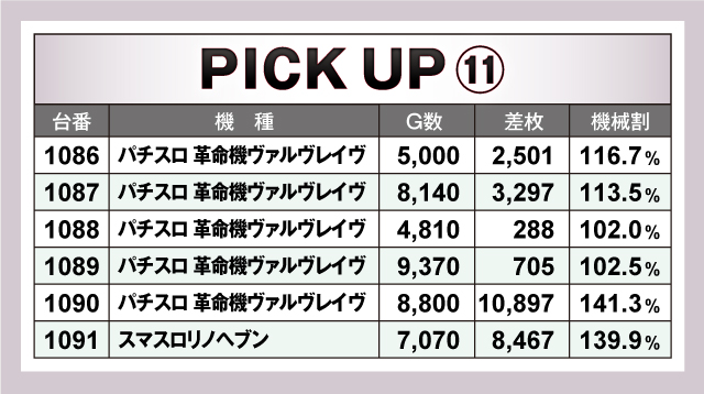 まずは優秀30台のPICK UPから紹介していこう。30台全てが+2,000枚を越え、+3,000枚以上は17/30台、+5,000枚オーバーは7/30台、そしてなんと+10,000枚オーバーは、1090番台「パチスロ 革命機ヴァルヴレイヴ」の+10,897枚、1007番台「スマスロ北斗の拳」の+10,567枚の2台も出現! 店内のあらゆる箇所が大賑わいだった!