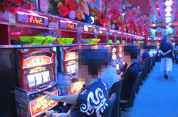 「沖ドキ!-30」や「ハナハナ鳳凰-30」といった沖スロコーナーもにぎやかな状況。