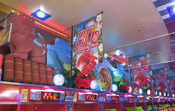 沖スロコーナーには、ハイビスカスやシーサーなどが飾られており、南国を連想させるような装飾品も素敵な「ニラク中野サンモール2号店」。パチスロの魅力を余すことなく堪能できる…そんな言葉がピタリと当てはまるホールであった。