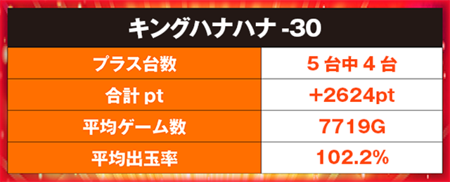 平均ゲーム数は7700G超と人気を集めたなかで、5台中4台がプラス。機種トータルで+2624ptとなった。