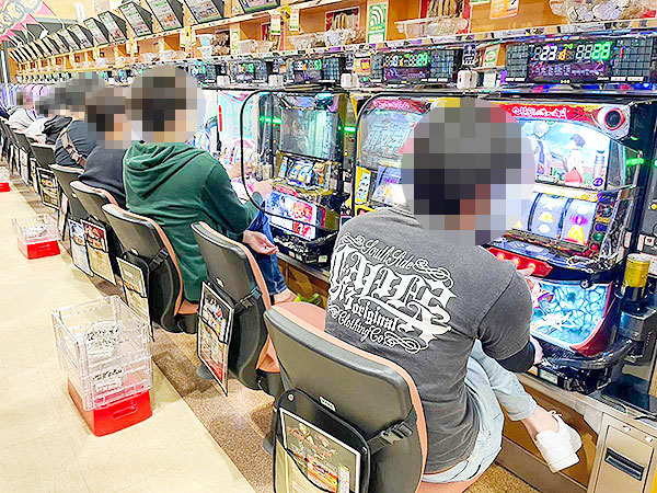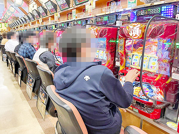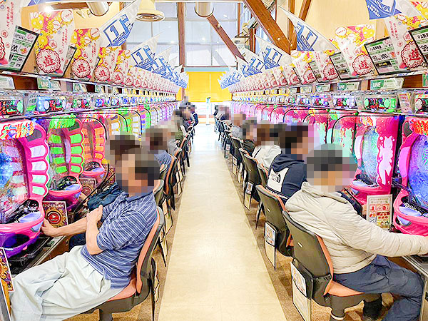 100円/89玉パチンコは海物語シリーズを中心に人気が集まっており、ほぼ満席となるほどの盛況ぶりだった。