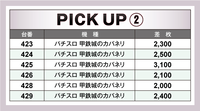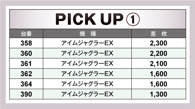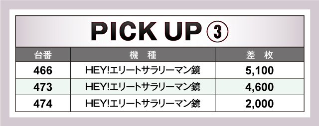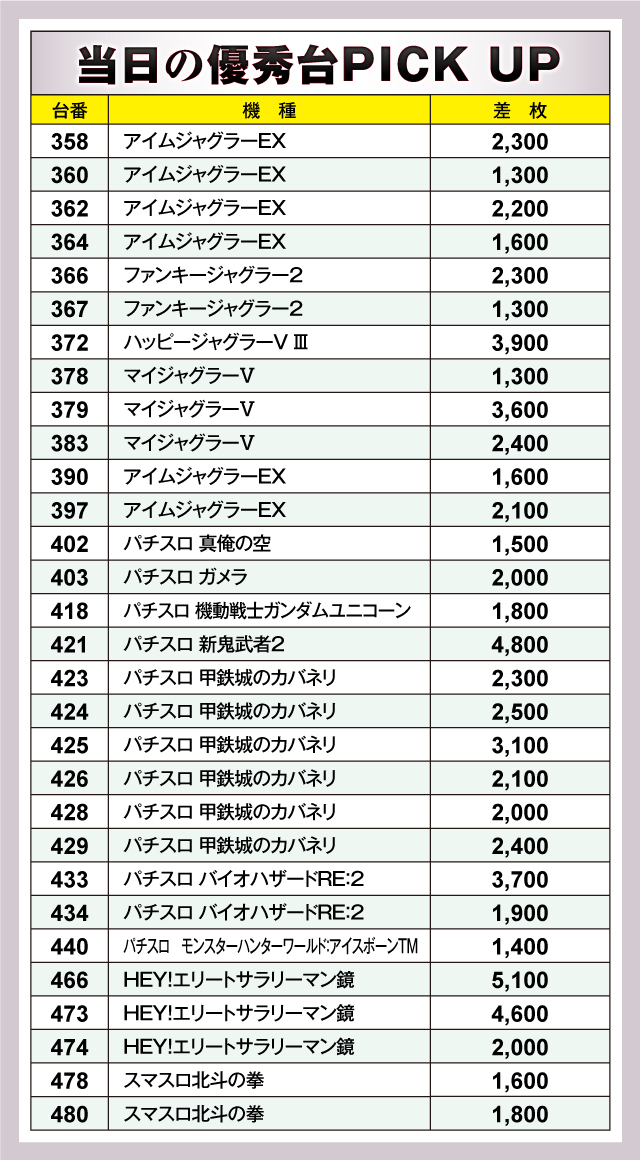 ピックアップ機種では、『アイムジャグラーEX』、『パチスロ甲鉄城のカバネリ』、『HEY!エリートサラリーマン鏡』の盛り上がりが目立っていた。
