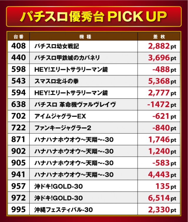 4月7日に実施された『キング観光サウザンド近鉄四日市店』の王様伝説をお伝えしよう。前回に引き続き、今回も各列で最も差枚数が良かった台をピックアップしている。注目はやはり話題沸騰中の『スマスロ北斗の拳』だろう。543番台から5,368pt! しっかりとした差枚数となった。しかし、それを上回る差枚となったのは『沖ドキ!GOLD-30』の972番台だ。6,514ptとなっており、優秀台の中ではトップ差枚となった。その他、各列のトップ差枚はご覧の通り。6.5号機やノーマルタイプにも十分な差枚となっている台が見受けられた。