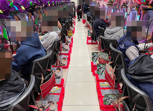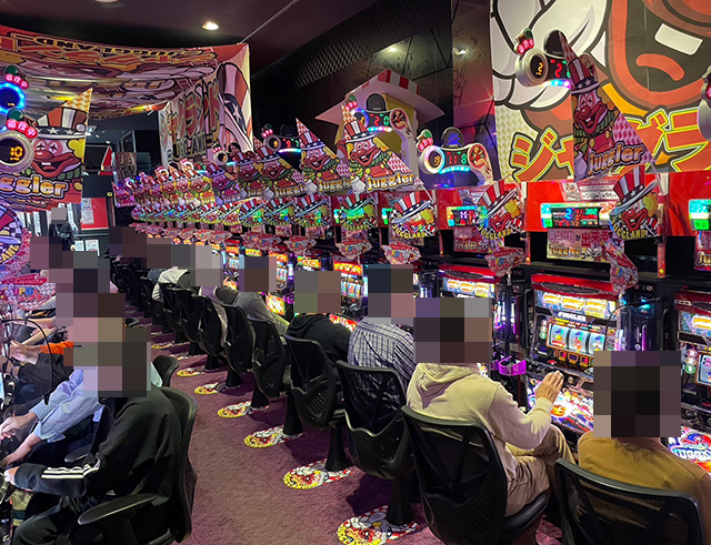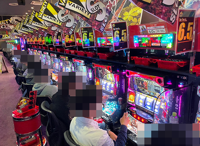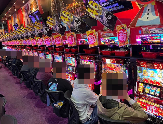 開店直後のパチスロコーナーでは、最新機種の6.5号機やスマスロなどが人気。続々と台が埋まっていき、いくつもの機種が満席となっていた。