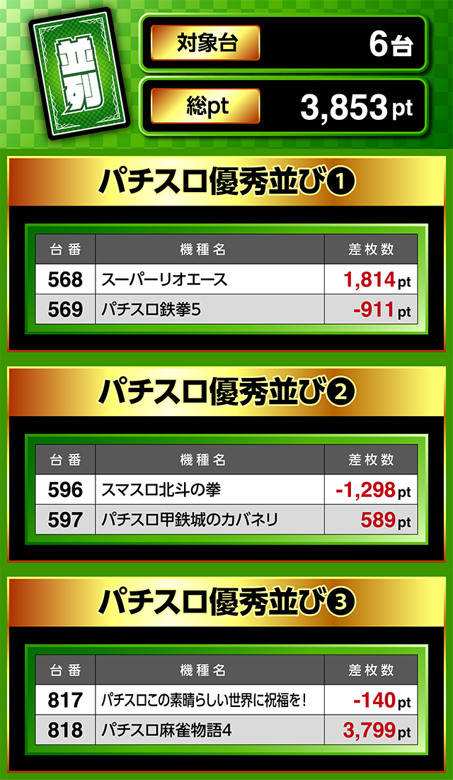 並列は、すべての並びにプラス台があり、818番台の「パチスロ麻雀物語4」が3,799ptとなった。