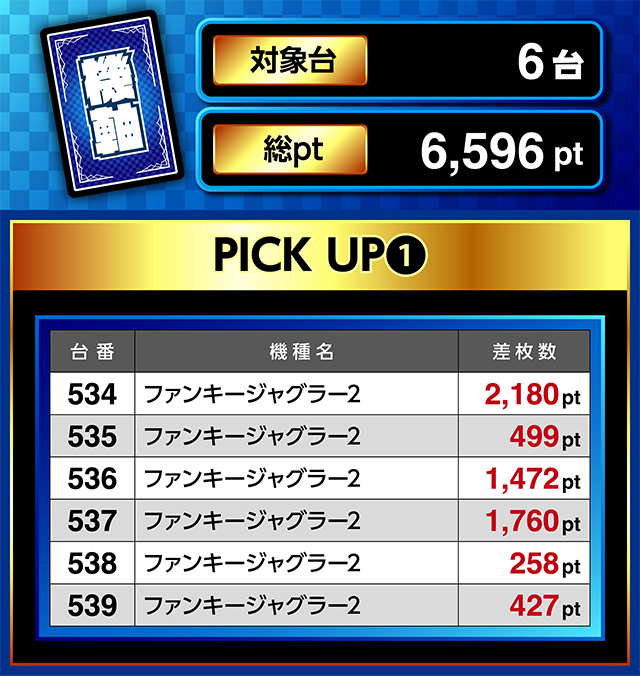 機軸は、「ファンキージャグラー2」で、6台のすべてがプラス。