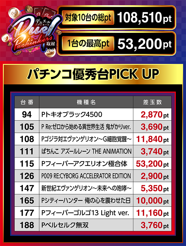 108番台の「Pゴジラ対エヴァンゲリオン~G細胞覚醒~」、165番台の「Pシティーハンター 俺の心を震わせた日」、177番台の「Pフィーバーゴルゴ13 Light ver.」なども10,000pt以上となった。