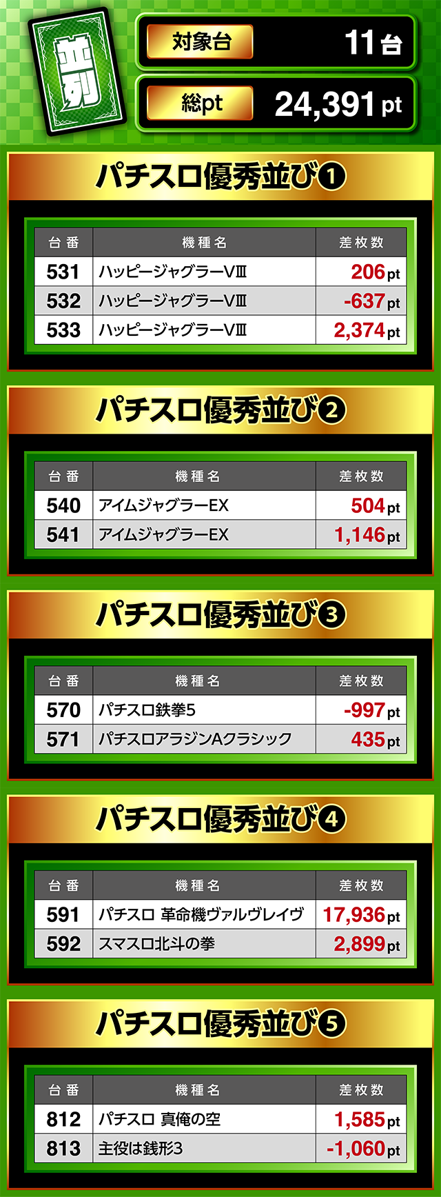 2,000ptを超えた台が複数あり、591番台の「パチスロ 革命機ヴァルヴレイヴ」は17,000ptを上回った。