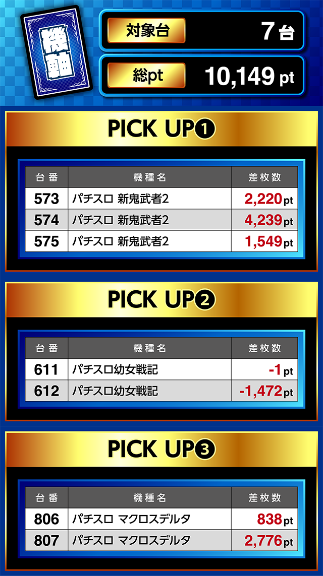 「パチスロ マクロスデルタ」も2台ともにプラスとなり、807番台が2,776pt。