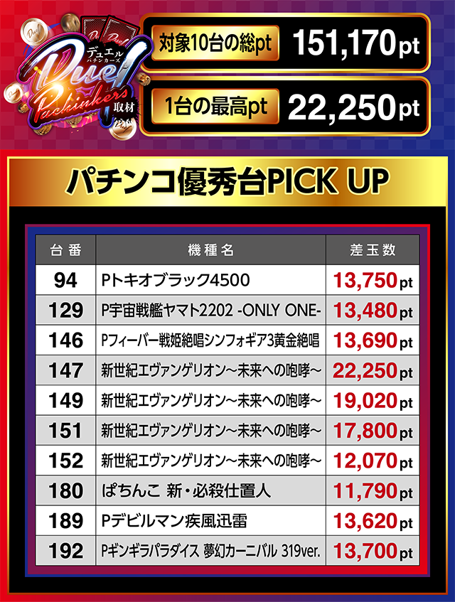 「新世紀エヴァンゲリオン~未来への咆哮~」は、22,250ptを記録した147番台など4台が12,000ptオーバー。