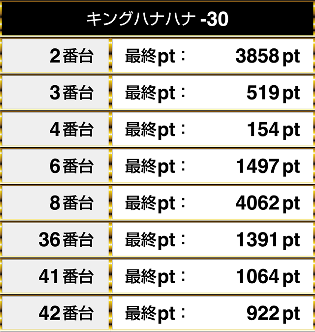 最終的には『キングハナハナ-30』の8台以上がプラスpt!