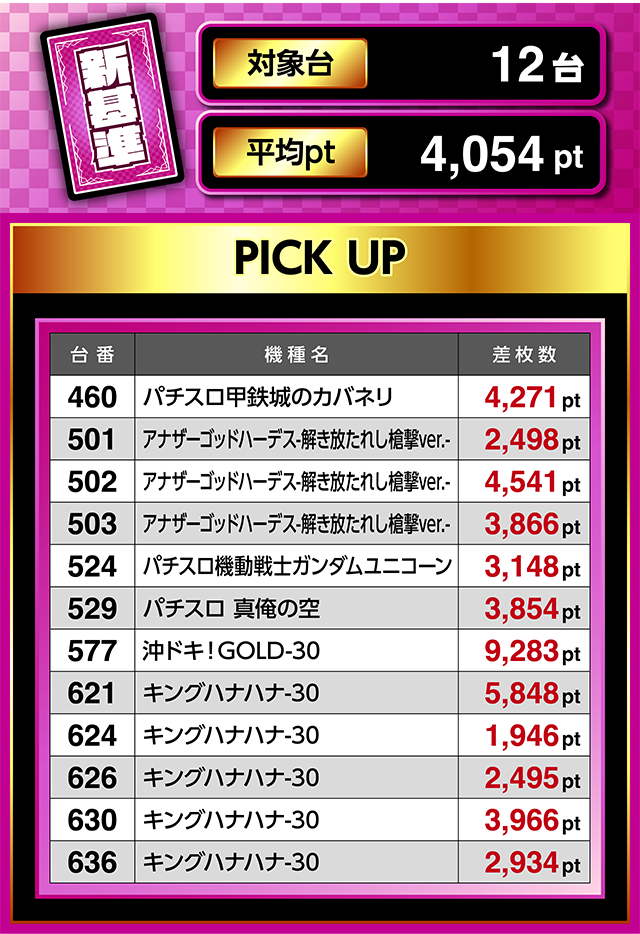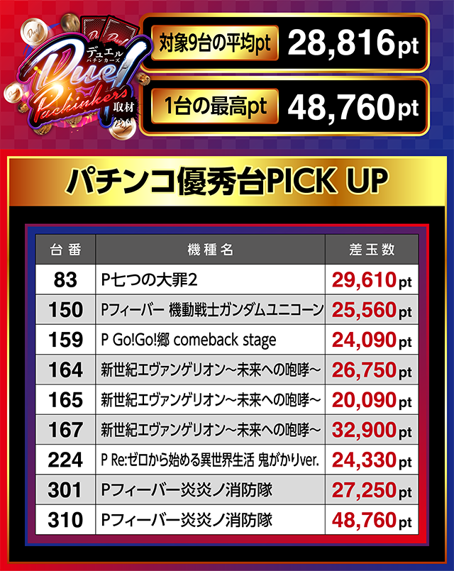 83番台の「P七つの大罪2」や150番台の「Pフィーバー 機動戦士ガンダムユニコーン」など、複数の機種が20,000ptを超えた。