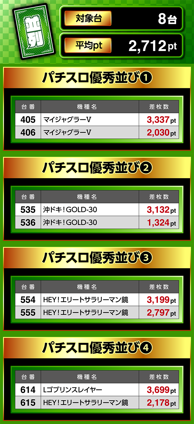 405番台の「マイジャグラーⅤ」が3,337pt、535番台の「沖ドキ!GOLD-30」は3,132ptとなった。