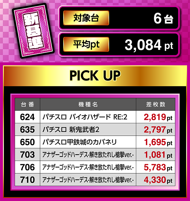 614番台の「Lゴブリンスレイヤー」も3,699ptと、最新機種も結果を残した。