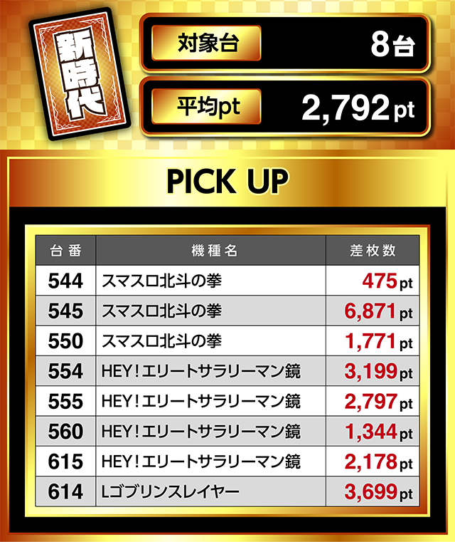 新時代は、545番台の「スマスロ北斗の拳」が6,800ptオーバー。