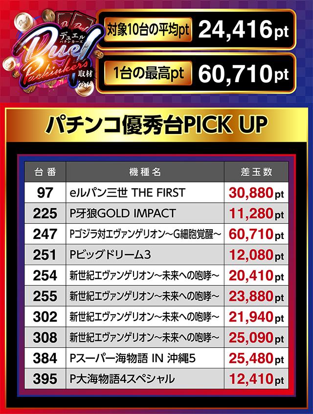 パチンカーズは、247番台の「Pゴジラ対エヴァンゲリオン~G細胞覚醒~」が60,710ptとなった。