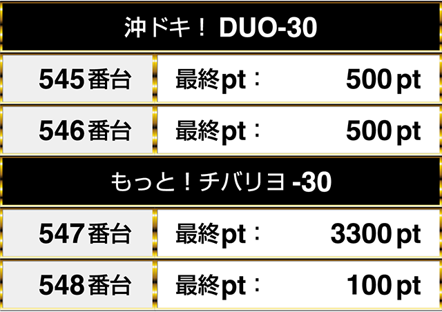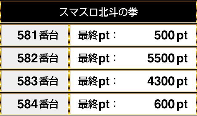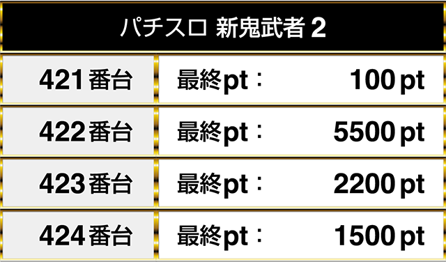 『スマスロ北斗の拳』と『パチスロ 新鬼武者2』も4台が連なってプラスptとなり、どちらにも5500ptのデータが残っていた。