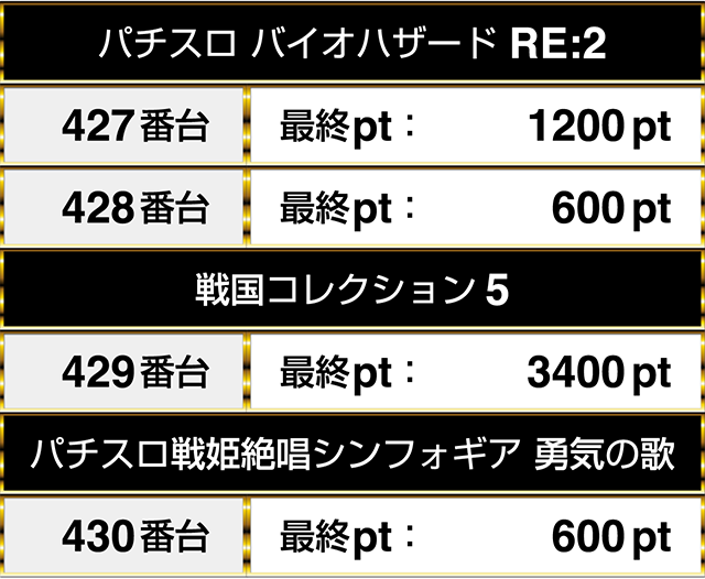 『パチスロ バイオハザード RE:2』の427番台から『パチスロ戦姫絶唱シンフォギア 勇気の歌』の430番台までが並んでプラスpt!!