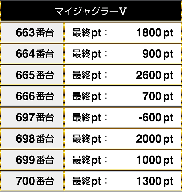 665番台は2600pt、698番台は2000ptを記録してこの日を終えた。