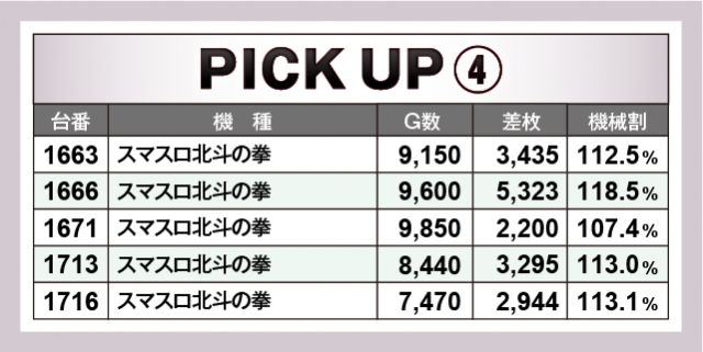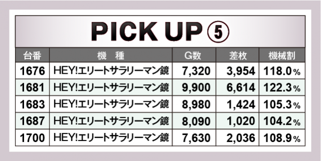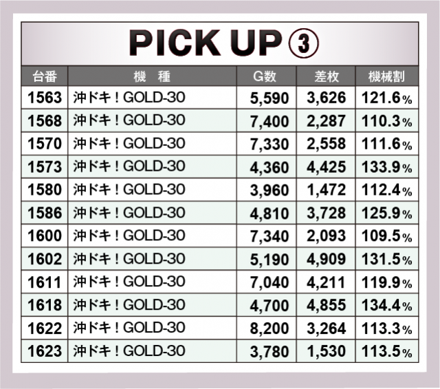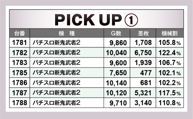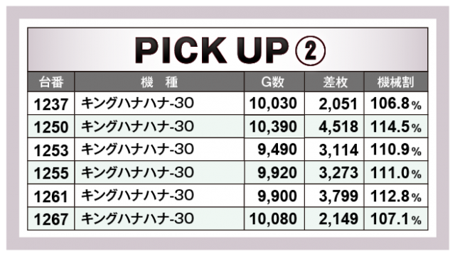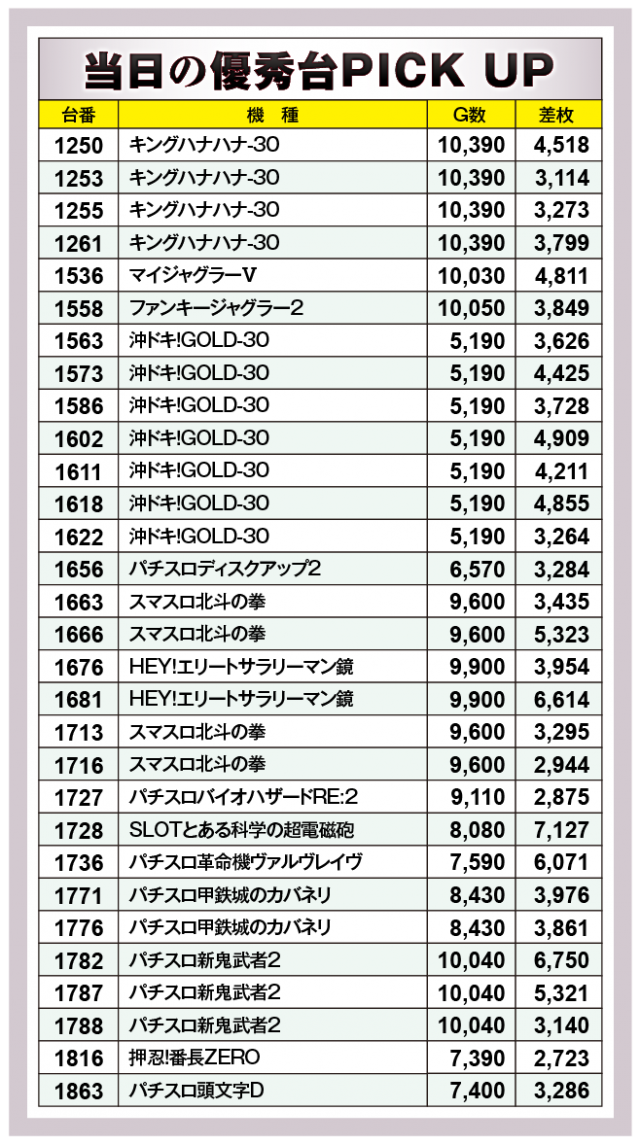 続いてはこの日好調だった5機種に注目。まず『パチスロ新鬼武者2』では設置全7台全てがプラス差枚となり、トータル差枚数は+2万枚オーバーを記録。次いで、『キングハナハナ-30』では1250番台の+4,518枚を筆頭に6台のトータル差枚数は+1万8千枚オーバーをマーク、また『沖ドキ!GOLD-30』では4台の+4千枚オーバー台を筆頭に12台のトータル差枚数は+3万8千枚オーバーをマークした。そして最新台『スマスロ北斗の拳』では1666番台の+5,323枚を筆頭に5台のトータル差枚数は+1万7千枚オーバー、また『HEY!エリートサラリーマン鏡』では1681番台の+6,614枚を筆頭にを5台のトータル差枚数は+1万5千枚オーバーを達成した。