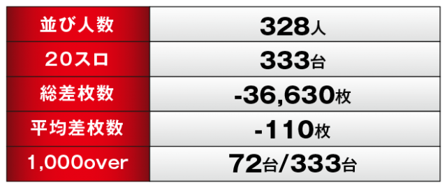 今回、[1000円/46枚] スロ全333台のトータル差枚数は-36,630枚とマイナスとなってしまったが、上述したことから分かるように、メイン機種から最新台と様々な機種が活躍し、ポテンシャルの高い台が多かったのは確かで、結果が伴わず悔しい1日となってしまった。しかしその事実は、遊技していたファン諸氏がよく分かっているだろう。次回実施時では巻き返しに期待し、今後も同店の動向や情報から目を離さないようしっかりチェックしておくことをオススメするぞ!