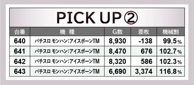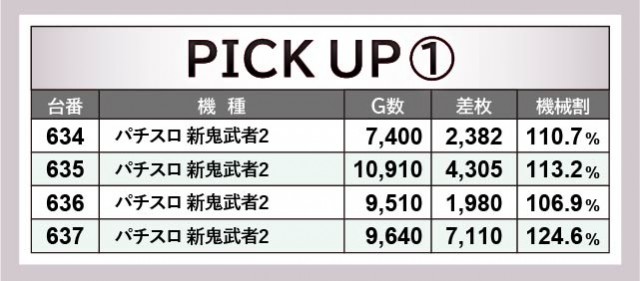 全4台設置されている『パチスロ 新鬼武者2』は、全台プラス差枚を達成している。635番台10,910G・4,305枚という記録も目覚ましく、どの台でも相当な手ごたえを感じていたはずだ。それは『パチスロ モンスターハンターワールド:アイスボーンTM』も同様だったが、643番台+3,374枚という記録が生まれたものの、全台プラス差枚とはならず。しかしファンは確信をもってレバーを叩いており、それは消化されたゲーム数から一目瞭然だろう。