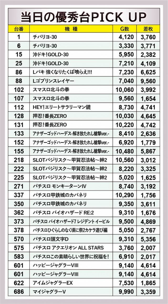 当日の最高記録となった『Lゴブリンスレイヤー』から+9,560枚という大きな熱気が放たれた。これに追随するかのように、『Lバキ 強くなりたくば喰らえ!!!』86番台+6,625枚や『アナザーゴッドハーデス-解き放たれし槍撃ver.-』155番台+5,867枚といった記録も生まれ、各所にて盛り上がりを確認できたことに好感を覚えるばかり。万回転OVERも6台、9千回転台も多数見られるなど、ファンは有意義な時間を過ごせたはずだ。