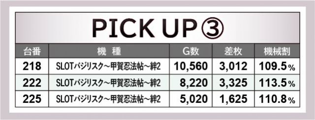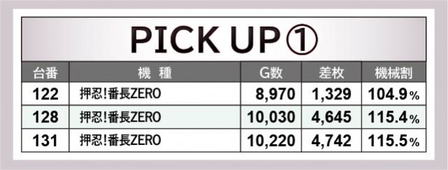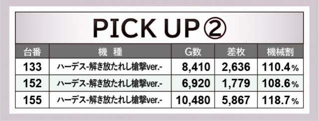 『押忍!番長ZERO』128番台+4,645枚や131番台+4,742枚、『SLOTバジリスク~甲賀忍法帖~絆2』218番台+3,012枚や222番台+3,325枚など、導入から今日に至るまで、最前線で活躍する名機が奮闘する姿を見せていた。これは同店がこれら機種を大切に扱っている証拠で、今後とも注目すべきエリアとなるだろう。そこに新機種『アナザーゴッドハーデス-解き放たれし槍撃ver.-』も加わり、155番台+5,867枚という大きな数字を残したのは見逃せないポイントだ。